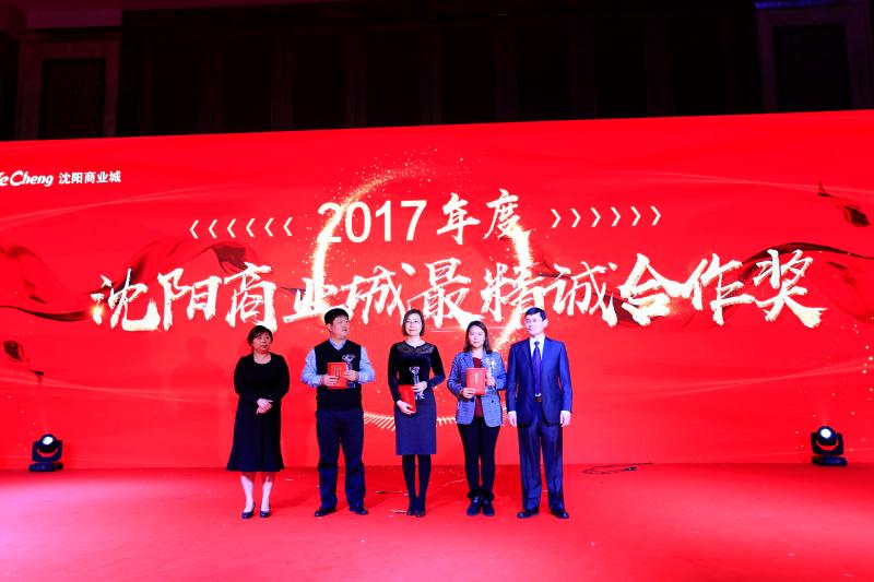 活動現(xiàn)場,陳哲元董事長、鐘靜總經(jīng)理代表沈陽商業(yè)城向萃華金店、周大福品牌、遼寧和慧倉商貿(mào)、影兒會所頒發(fā)了2017年度最精誠合作獎。