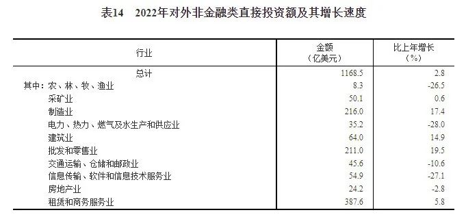 全年對(duì)外非金融類直接投資額7859億元,比上年增長7.2%,折1169億美元,增長2.8%。其中,采礦業(yè)2022年對(duì)外非金融類直接投資額50.1億美元,比上年增長0.6%。